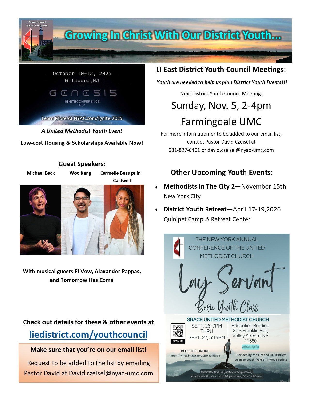 Sunday, Nov. 5, 2-4 PM, Farmingdale UMC, Youth Council meeting
